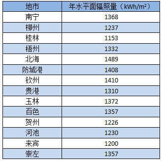 表2:廣西省各地水平面年輻照總量一覽表