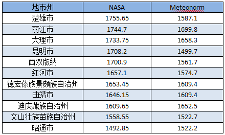 表3:云南省各地水平面年輻照總量一覽表