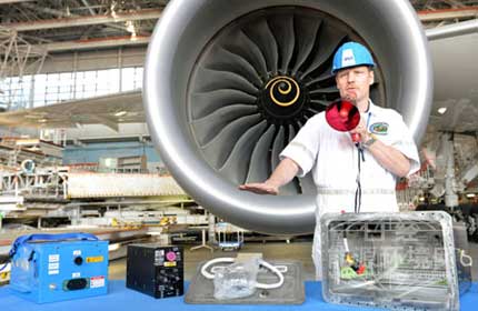 波音維修師正在介紹全日空波音787飛機(jī)上配備的(左起)改進(jìn)型電池、充電器、電池容器蓋及容器。