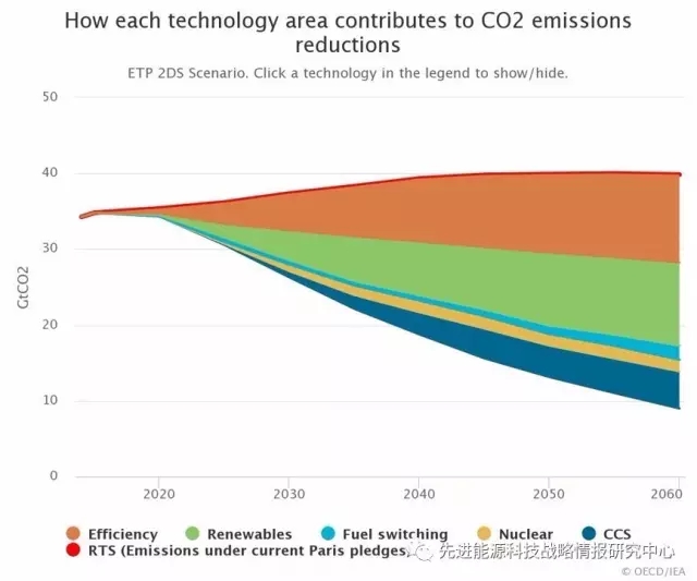 圖1 2DS情景中各技術(shù)領(lǐng)域在減少CO2排放量方面的基準(zhǔn)貢獻度