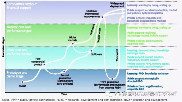 創(chuàng)新必須在從早期研究到全面示范和部署的各個階段均得到支持。向新的能源系統(tǒng)轉(zhuǎn)型需要漸進和激進的創(chuàng)新。在創(chuàng)新的所有階段,如從基礎(chǔ)和應(yīng)用研究到開發(fā)、示范和部署階段,各國政府的長期支持均非常重要。將資源分配給各種技術(shù)必須考慮創(chuàng)新的短期和長期機遇及挑戰(zhàn),同時反映技術(shù)成熟度。