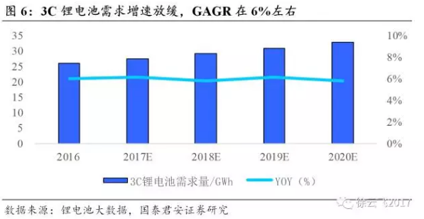 軟包鋰電池的下游市場可細(xì)分為3C領(lǐng)域、動力領(lǐng)域和儲能領(lǐng)域。軟包電池的應(yīng)用首先是在3C領(lǐng)域,其發(fā)展歷程隨著數(shù)碼電池的內(nèi)部集成進(jìn)程而快速發(fā)展,尤其是在筆記本電腦、手機等電池的集成化,截止到2016年軟包電池的滲透率近60%,但近年來傳統(tǒng)3C產(chǎn)品消費增速的放緩,高滲透率下,相應(yīng)軟包的需求增速也在逐步放緩。與此同時,隨著新能源汽車持續(xù)高增長,2016年動力電池出貨量大增成為鋰電池行業(yè)發(fā)展的主驅(qū)動力,當(dāng)前軟包鋰電市場滲透率也不斷提高,2016年近12%。而儲能市場則是鋰電池應(yīng)用的新興領(lǐng)域,短期應(yīng)用軟包較少,未來隨著軟包成本的下降,在此領(lǐng)域也具備較大的增長潛力。