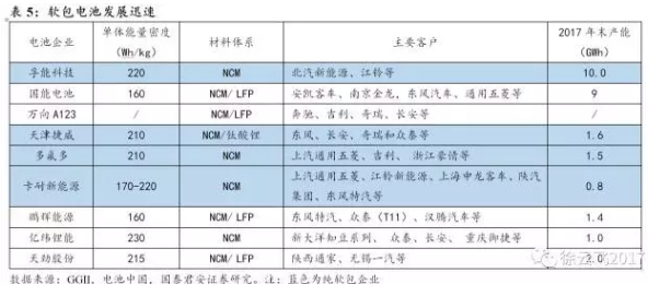 三元軟包能量密度大幅提升。高工鋰電數(shù)據(jù)顯示,截止2017年5月,軟包電池單體能量密度超過160wh/kg的企業(yè)有14家,部分廠商的軟包單體能量密度達(dá)到220wh/kg及以上,如孚能科技等,孚能科技PACK后的系統(tǒng)能量密度在140-160wh/kg,遠(yuǎn)高于補貼能量密度要求,預(yù)計其配套穩(wěn)定的表現(xiàn)將持續(xù)促進(jìn)其他企業(yè)在軟包動力鋰電池方面的研發(fā)布局和生產(chǎn)競爭。