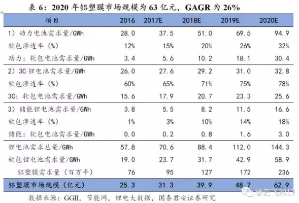隨著軟包鋰電池需求擴張,2020年我國鋁塑膜市場規(guī)模將達(dá)63億元。我們根據(jù)2017年-2020年的動力儲能和3C軟包鋰電池需求,分別根據(jù)動力儲能和3C不同類型的鋁塑膜價格,計算得出2017-2019 年我國鋁塑膜需求為 0.95 億平、1.27億平、1.72億平,2.36 億平,對應(yīng)市場空間為31億元、39億元、49億元、63億元,GAGR為26%。