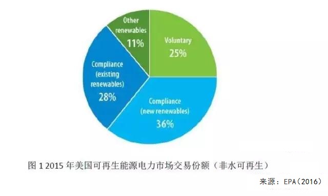 以2015年為例,美國(guó)自愿綠電市場(chǎng)的交易電量已經(jīng)占據(jù)了非水可再生能源電力交易的四分之一(圖1)。自愿的綠電市場(chǎng)與為滿足配額制要求而存在的強(qiáng)制市場(chǎng)相輔相成,共同促進(jìn)了美國(guó)可再生能源的發(fā)展。