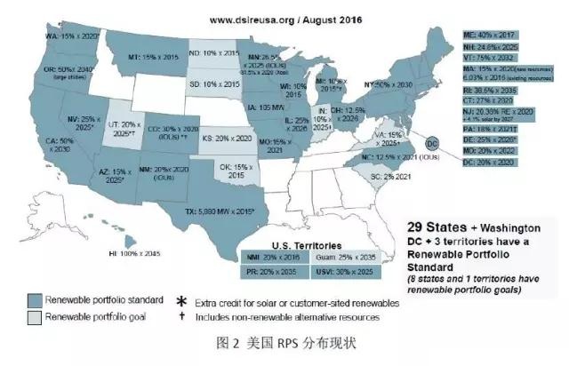 其中,強(qiáng)制市場(chǎng)主要發(fā)生在批發(fā)市場(chǎng),是為滿足當(dāng)?shù)氐目稍偕茉磁漕~目標(biāo)(RPS)而產(chǎn)生的,目前美國(guó)已有29個(gè)州以及華盛頓哥倫比亞特區(qū)實(shí)施了RPS(圖2)。由于配額目標(biāo)多針對(duì)電力供應(yīng)商,即要求其提供給用戶的電量中有一定比例的非水可再生能源電量,所以電力供應(yīng)商是強(qiáng)制市場(chǎng)的主要買方。為滿足配額要求,電力供應(yīng)方或通過(guò)提高自身非水可再生電力供應(yīng)比例,或選則在強(qiáng)制市場(chǎng)購(gòu)買綠證,電力供應(yīng)商的履約成本將均勻傳導(dǎo)至其供電范圍內(nèi)的所有用戶。