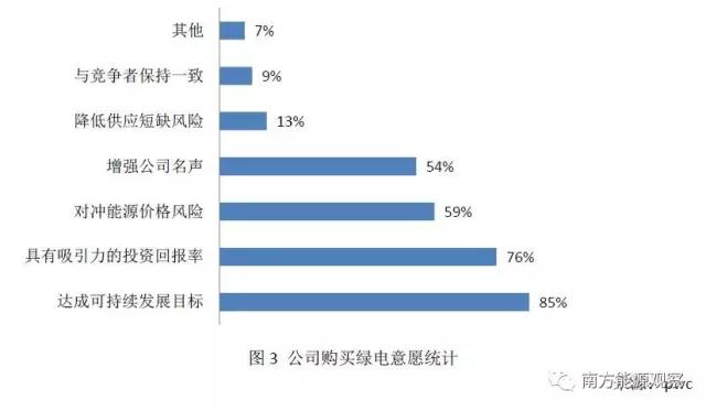 普華永道(pwc)曾在2016年對(duì)總部在美國(guó)的部分大型公司做了一項(xiàng)關(guān)于購(gòu)買綠電的調(diào)查,涉及行業(yè)包括IT、零售、制造、金融、健康、醫(yī)療等。調(diào)查范本中72%的公司購(gòu)買了綠電,而完成公司內(nèi)部的可再生能源目標(biāo)是購(gòu)買綠電的首要原因(圖3)。