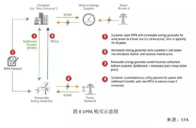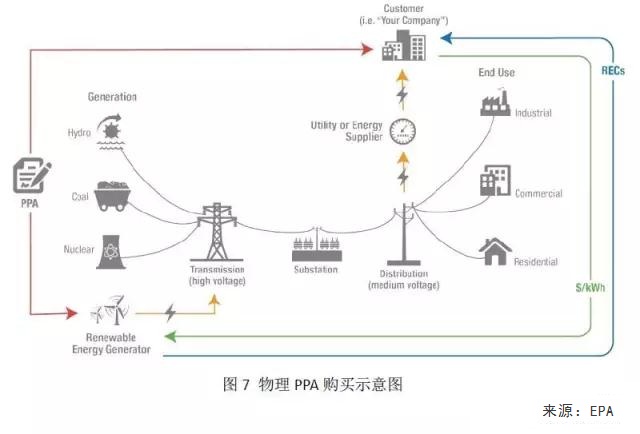 PPA 通常是用戶和電廠直接簽訂的購(gòu)電合同,電價(jià)固定,合同通常持續(xù)時(shí)間為10-20年,PPA還可以分為場(chǎng)內(nèi)(On-Site)和場(chǎng)外(Off-Site),本文中的PPA均指場(chǎng)外。用于綠電的PPA又可分為兩大類,一類是物理意義上的PPA,一類是金融意義上的虛擬PPA(VPPA)。其中物理意義上的PPA流程如圖6: