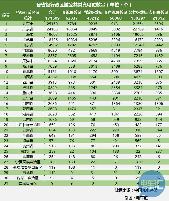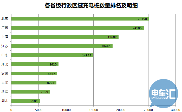從城市來看,省級行政區(qū)域內(nèi)所擁有的公共類充電樁數(shù)量前十的分別是,北京25150個、廣東24185個、上海19602個、江蘇18496個、山東14982個、河北8620個、安徽8367個、天津8224個、浙江7059個、湖北5181個。