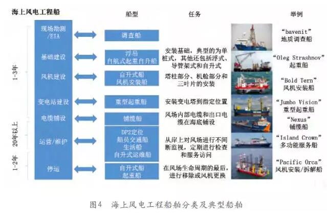 另外,海上風(fēng)電工程裝備還包括針對(duì)海上風(fēng)電場(chǎng)開(kāi)發(fā)的特殊船舶,主要可以分為兩大類:海上風(fēng)電安裝船和風(fēng)電運(yùn)維船。