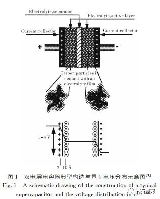 一類為雙電層電容器,如圖1所示,其利用電極內部的過剩電荷和電解液中的異號離子在電極表面形成的緊密的雙電荷層來存儲電荷。雙電層結構非常接近于平板電容器的兩極,因此其電容效應也與之接近,可以 用公式C=ε0εA/d來大致表達電容量與雙電層結構各參數的關系,其中C為電容器的容量,ε0為真空電容率,ε為介電系數,A為極板表面積,d為極板間距。