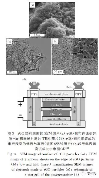Ruoff課題組于2008年率先報道了使用化學修飾石墨烯作為超級電容器電極材料的工作,他們使用改良的Hum-mers法制備的石墨烯電極在水系和有機 電解液中分別展現了135F/g和99F/g的比容量,如圖3所示。之后,該組又用微波加熱的方法還原GO,并對產物進行活化處理得到多孔石墨烯。多孔石墨烯的比表面積高達3100m2/g,在TEABF4/AN中的比容量提高到了166F/g,相應地能量密度提高到了70Wh/kg。