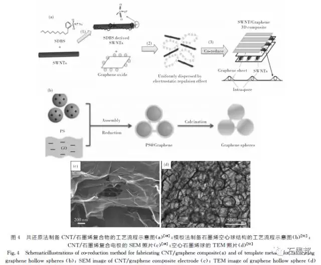 Tang課題組先引入了單壁CNTs作為間隔物與rGO混合制備了復合電極,該電極在水系和有機電解液中分別展現了290F/g和201F/g的比容量。之 后,該課題組又改進了間隔工藝,利用GO易分散的優(yōu)點,先將CNTs和GO均勻 混合,之后對混合物進行“共還原”反應 (見圖4(a))。所得復合物(見圖4(c))在離子液EMI- TFSI中的比容量達到了261F/g,能量密度達到了123 Wh/kg(3.7V)。
