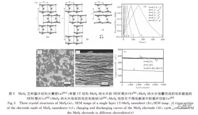 Chhowalla課題組在2015年發(fā)表了使用化學剝離法制備MoS2納米片并將其重新堆疊為具有平行排列的片層 結構的電容器電極的研究成果,如圖5(b)—(e)所示。他們制得的1T排列的MoS2納米片具有很高的導電性,重新堆疊所得到的放大的層間距保證了H+、Li+、Na+和K+可以順利地進行插層,從而 提供高達400~700F/cm3的 體 積比電容。該電極的循環(huán)性能和倍率性能同樣非常出色。