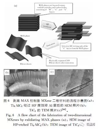 過渡金屬碳/氮化物是一種新型的具有二維結構的納米材料。Naguib等于2011年首次報道了使用刻蝕除去Ti3AlC2中的Al,并對產物進行超聲剝離的方法制得Ti3C2納米片的工作,由此拉開了MXene的制備和應用研究的序 幕,Ti2AlC、Ta4AlC3、TiNbAlC、3AlC2、Ti3AlCN、Ti3AlC2等一系 列MAX相被剝離生成對應的MXene。目前,MXene的制備方法仍以選擇性刻蝕前驅體MAX相為主(見圖6)。