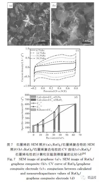 Wu等使用溶膠凝膠法結合低溫退火的工藝制備了RuO2占38.3%比例的RuO2/石墨烯的復合物(見圖7),該復合物在1mol/L的H2SO4中得到了570F/g的高比容量(1mV/s)。