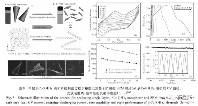 Wang等制備出單層β-Co(OH)2 ,并將其與GO復合形成電極,如圖8 所示,該電極比容量為2080F/g(1A/g)且具有優(yōu)秀的循環(huán)性能。