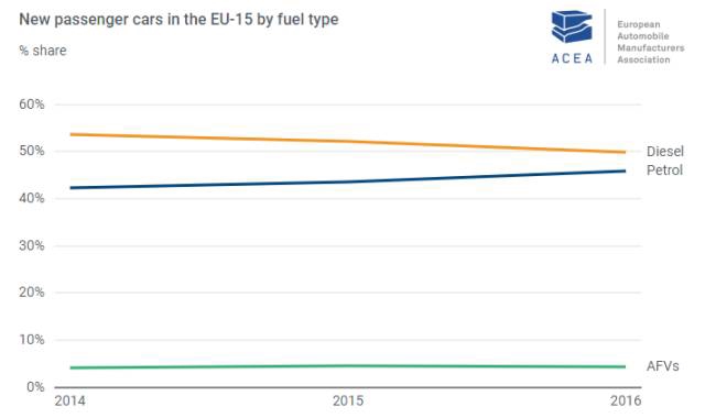 然而,就在柴油機(jī)達(dá)到它的市場(chǎng)高峰之時(shí),排放門事件的曝光,讓柴油車在2016年市場(chǎng)占比首次跌落50%。