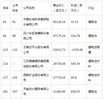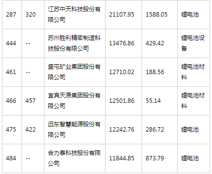 中國儲能網訊:7月31日,2017《財富》中國500強企業(yè)排行榜發(fā)布。經過梳理后發(fā)現(xiàn),12家鋰電池相關企業(yè)入選,其中江蘇國泰、合力泰2家鋰電池產業(yè)鏈公司均為首次入選中國500強。