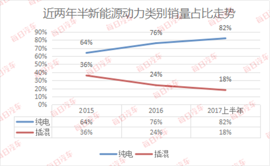 知豆D2和北汽EC180銷量的崛起,與唐銷量萎縮,實則是因為國內(nèi)純電動市場趨于穩(wěn)步上行,插混市場持續(xù)下行。從近兩年半新能源動力類別銷售走勢來看,純電動從2015年64%份額增長至上半年82%,其標志是北京超過上海成為中國最大新能源汽車市場。