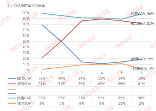 與傳統(tǒng)汽車市場一致,SUV也是插混市場大熱門。經(jīng)歷年初兩個月的動蕩,后四個月趨于穩(wěn)定,SUV占比插混市場8成以上。