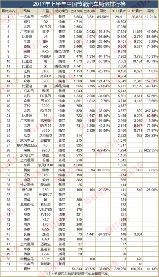 節(jié)能汽車車型銷量冠軍由一汽豐田卡羅拉雙擎摘得,上半年累計銷量29,411輛,同比增長85.58%,比新能源第一名知豆D2多了10,718輛。