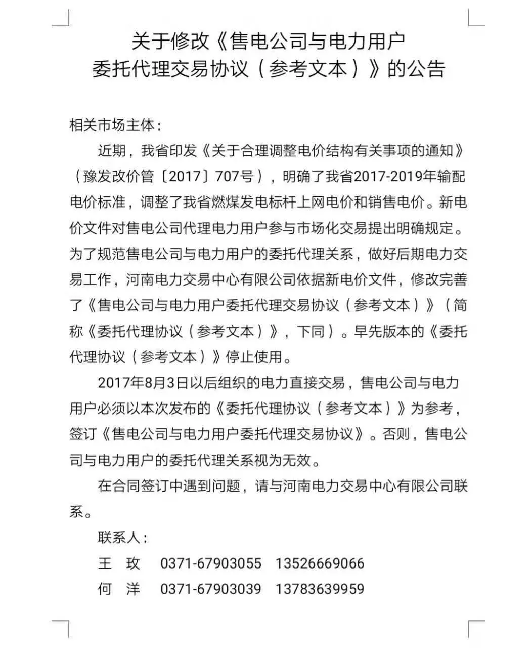 因?yàn)楹贤Y(jié)算有很多的問(wèn)題,河南省交易中心也發(fā)布了《關(guān)于修改售電公司與電力用戶委托代理交易協(xié)議(參考文本)》的公告,并希望能夠更好的杜絕以后這樣的事情發(fā)生。公告中提到了原本的委托代理協(xié)議停止使用。2017年8月3日以后組織的電力直接交易,售電公司與用戶必須要以新的委托代理協(xié)議為參考簽訂。(文末附通知公告原文件)