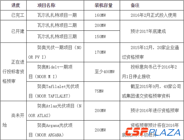 表:已公布的摩洛哥太陽能項目一覽