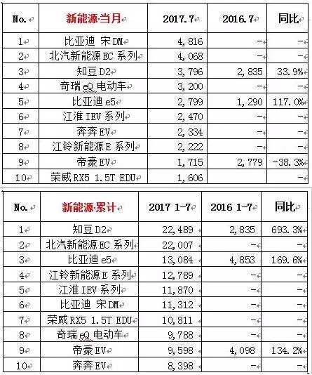 (7月當月及1-7月累計新能源乘用車領域銷量排行)