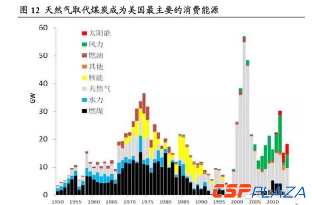 美國能源結(jié)構(gòu)主導(dǎo)者由煤炭變?yōu)樘烊粴?。美國擁有世界上最大的煤炭儲量,是世界第二大煤炭生產(chǎn)國,回顧美國能源發(fā)展歷史,直到20世紀(jì)80年代煤炭裝機(jī)量占比維持在較高的水平。自2000年以來,隨著美國頁巖氣革命的成功和向全世界蔓延,天然氣逐漸在美國能源結(jié)構(gòu)中占據(jù)絕對主導(dǎo)地位。