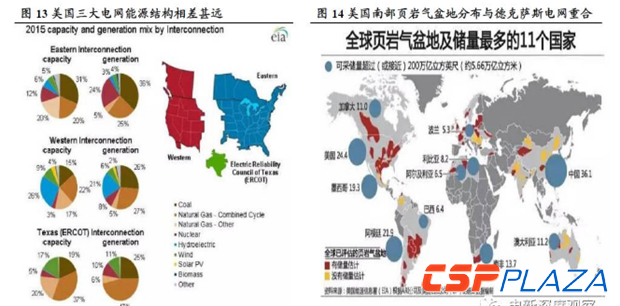 中國儲能網(wǎng)訊:能源結(jié)構(gòu)決定中美電網(wǎng)差異化形態(tài)。①東部電網(wǎng)地區(qū)因靠近美國主要煤、氣供應(yīng)地而以煤炭和天然氣發(fā)電為主。②西部電網(wǎng)地區(qū)則因靠近科羅拉多山系和河流,分布有落基山脈等地勢落差很大的山體,主要以水電裝機(jī)為主。山脈地形客觀上也阻礙了西部電網(wǎng)對外聯(lián)結(jié)的發(fā)展。③南部的德克薩斯電網(wǎng)處于頁巖氣盆地所在地,天然氣發(fā)電一家獨(dú)大,形成了區(qū)域內(nèi)的獨(dú)立小電網(wǎng)。
