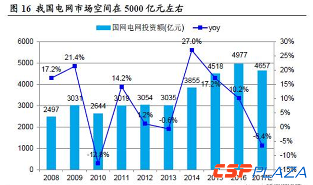 我國電網(wǎng)投資市場空間在5000億元左右。國家電網(wǎng)投資額從2008年2500億元增長至2016年近5000億元,8年時(shí)間投資額增長一倍,年均復(fù)合增速達(dá)到9%,近年國家電網(wǎng)投資額保持在4500億元以上,投資額增速逐年下降,市場空間保持在5000億元左右。2017年投資額增速預(yù)估為-6.4%,相較于2016年10.2%的增速下降趨勢十分明顯。