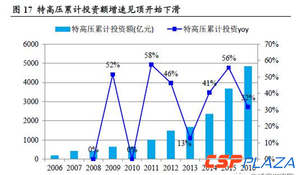 特高壓投資額增速陷入瓶頸期。特高壓累計(jì)投資額在2012年之前年均復(fù)合增速在20%左右,2014年開始進(jìn)入快速增長,2015年增速超過50%,增速接近天花板,2016年特高壓累計(jì)投資額增速同比下降超過20個(gè)百分點(diǎn),這一趨勢受我國電網(wǎng)投資額整體減速影響較大。