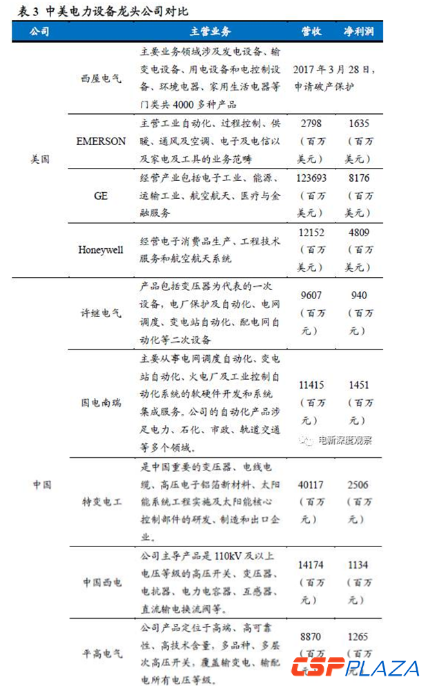 由于1975-1999年的20多年美國輸變電主網(wǎng)投資額處于停滯狀態(tài),因此美國電力設(shè)備龍頭均呈現(xiàn)多元化的業(yè)務(wù)結(jié)構(gòu)。通過中美電力設(shè)備龍頭公司的對比,美國電力設(shè)備公司與中國電力設(shè)備公司均在其傳統(tǒng)業(yè)務(wù)領(lǐng)域存在明顯瓶頸,美國電力設(shè)備龍頭多向其他領(lǐng)域轉(zhuǎn)型延伸,因此業(yè)績規(guī)模較大,中國電力設(shè)備龍頭的業(yè)務(wù)尚未多元化,業(yè)績規(guī)模相對較小。