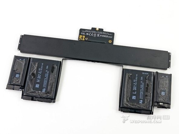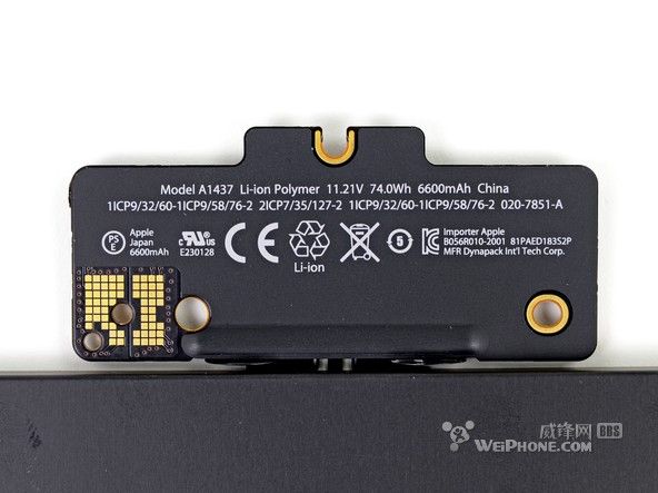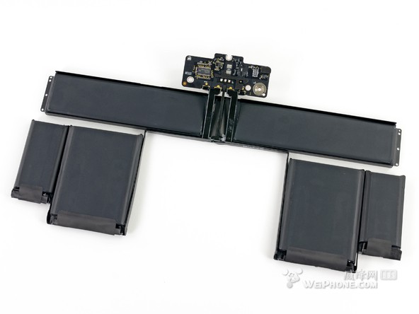 整塊電池一共由6個(gè)電池單元組成,整體看上去就像一個(gè)衣架。和 15 英寸 Retina Macbook Pro 的電池設(shè)計(jì)相比,“衣架”風(fēng)格的設(shè)計(jì)為 13 英寸 Retina Macbook Pro 的內(nèi)部節(jié)省了許多空間。