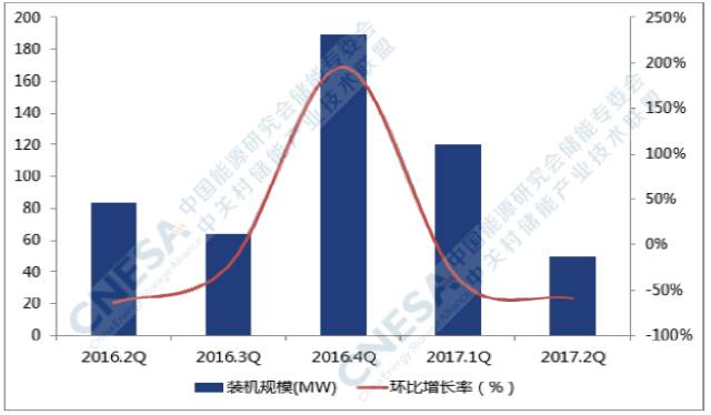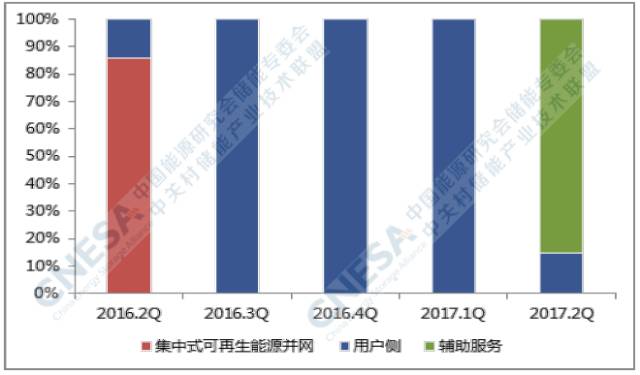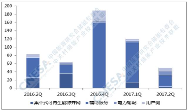 從應(yīng)用分布上看,全球新增投運項目中,輔助服務(wù)領(lǐng)域的裝機規(guī)模最大,為28MW,所占比重為56%,同比下降42%,環(huán)比2017年一季度下降72%。
