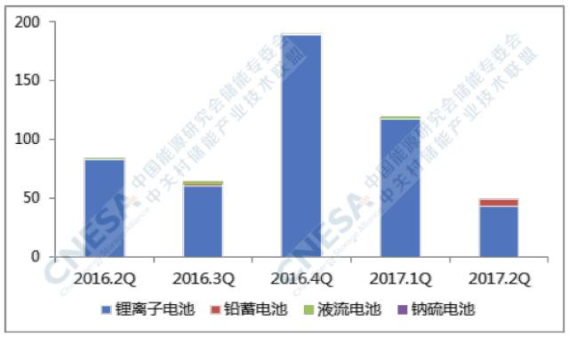 從技術(shù)分布上看,全球新增投運項目中,主要以鋰離子電池和鉛蓄電池的應(yīng)用為主,且鋰離子電池的裝機規(guī)模最大,為43.2MW,所占比重為87%,同比下降35%,環(huán)比2017年一季度下降64%。