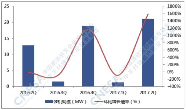 2017年二季度,中國新增投運電化學(xué)儲能項目的裝機規(guī)模為21.1MW,同比增長65%,環(huán)比2017年一季度增長1588%。華北地區(qū)的新增投運裝機規(guī)模最大,所占比重為91%。