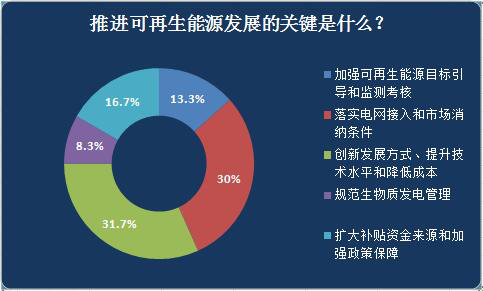在調(diào)查中,認(rèn)為推動(dòng)可再生能源關(guān)鍵在于落實(shí)電網(wǎng)接入和市場(chǎng)消納條件的占受訪者的30%。
