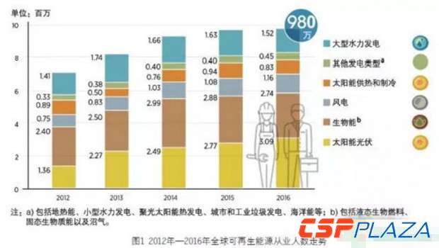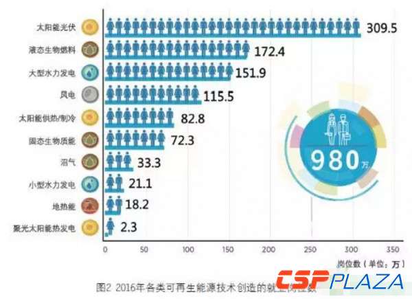 2016年,全球可再生能源產(chǎn)業(yè)共創(chuàng)造了980萬個就業(yè)崗位,同比增加1.1%。其中的830萬人集中在非水可再生能源行業(yè),比2015年高出2.8個百分點。