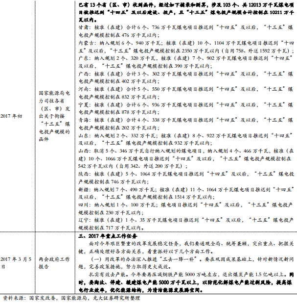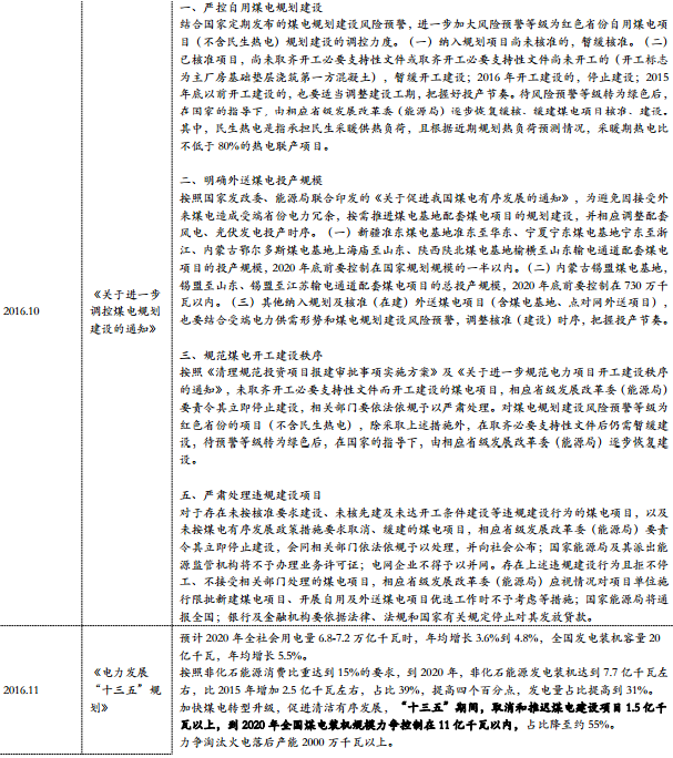 2016年10月,國家能源局發(fā)布《關于進一步調控煤電規(guī)劃建設的通知》,嚴控自用煤電規(guī)劃建設,明確外送煤電投產規(guī)模,規(guī)范煤電開工建設秩序,嚴肅處理違規(guī)建設項目,以期進一步化解“十三五”煤電潛在過剩風險。