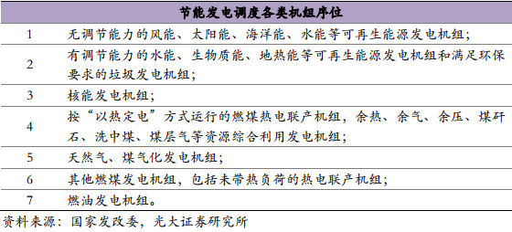 為實現(xiàn)提高電力源使用效率,減少環(huán)境污染,促進能源和電力結構調整,國家發(fā)改委2007年頒布了《節(jié)能發(fā)電調度辦法》,在保障電力可靠供應的前提下,按照節(jié)能、經濟的原則,優(yōu)先調度可再生發(fā)電資源,按機組能耗和污染物排放水平由低到高排序,依次調用化石類發(fā)電資源,如下表。其中特別指出的是:同類型火力發(fā)電機組按照能耗水平由低到高排序,節(jié)能優(yōu)先;能耗水平相同時,按照污染物排放水平由低到高排序。