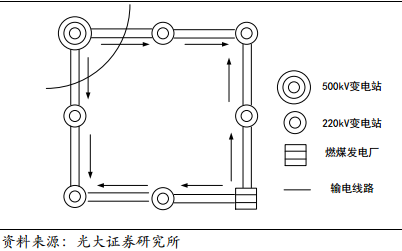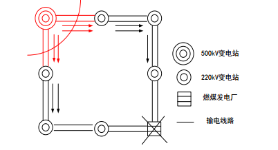 由于電網的差異性,必須具體問題具體分析,不可一概而論。以一個或若干個500kV變電站為“單位”進行分析,每個500kV變電站下帶若干個220kV變電站,220kV變電站、線路和接入220kV電壓等級的電廠組成較為緊密的區(qū)域電網結構,500kV變電站和電廠作為“電源”,220kV變電站作為“負荷”,實現(xiàn)該“單位”內的平衡,一旦電廠產能減小,為了滿足負荷需求,變電站及相應線路負載率升高,可能出現(xiàn)過載問題。因此根據電網情況差異,需分析論證后確定去產能的可行性。如圖所示典型結構,正常情況下(左圖),斷面處潮流正常,電網各節(jié)點運行正常,電廠出力消失后,斷面處潮流明顯將增加,同時500kV變電站所帶負荷將同時增加,出現(xiàn)過載情況(右圖)。
