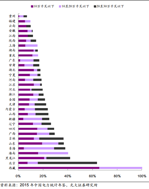 如下圖統(tǒng)計可以看出,30萬千瓦以下級火電機組占比超過全國平均水平21.43%的地區(qū)有14個,多集中在華北、東北和西北區(qū)域以及個別水電大省,這些地區(qū)供給側改革的空間較大,若能順利快速實施,所在區(qū)域機組質量優(yōu)質的火電企業(yè)將會獲得利用小時的提升空間。建議關注的地方上市公司包括:京能電力、金山股份、天富能源、漳澤電力、通寶能源、內蒙華電等。