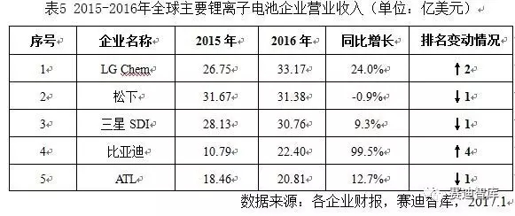 2016年全球鋰離子電池產(chǎn)業(yè)企業(yè)格局較2015年發(fā)生了明顯變化。LG Chem憑借24%的增速躍居至全球首位,首次超過松下、三星,主要原因在于其動(dòng)力電池被各大電動(dòng)汽車領(lǐng)域廣泛采用;松下下滑至第二,2016財(cái)年鋰離子電池業(yè)務(wù)收入較2015財(cái)年小幅下滑,主要在于消費(fèi)類產(chǎn)品需求下降而動(dòng)力電池大客戶特斯拉增幅有限;三星SDI降至全球第三,受Note 7爆炸事件影響2016年增速出現(xiàn)了明顯下滑。比亞迪憑借將近100%的增速一舉超過包括ATL、索尼等在內(nèi)的企業(yè)躍升全球第四,ATL位居第五,兩者差距十分微小,但比亞迪和ATL與全球前三的差距較大。