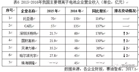 2016年,我國(guó)鋰離子電池產(chǎn)業(yè)格局變動(dòng)不大。比亞迪和CATL的鋰離子電池營(yíng)業(yè)收入均首次突破100億元,排名首位的仍然是比亞迪,2016年其鋰離子電池業(yè)務(wù)收入到達(dá)150億元,增速也超過了100%;排名次席的還是CATL(寧德時(shí)代新能源科技股份有限公司),2016年其業(yè)務(wù)收入100億元,同比增長(zhǎng)超過60%,CATL與全球第五位的ATL直接差距非常?。簧钲谖痔噩斠慌e從第六躍升至第三,得益于其業(yè)務(wù)收入高達(dá)170%的增長(zhǎng)速度;國(guó)軒高科也躍升了2位至第四,營(yíng)業(yè)收入達(dá)到50億元,增速也超過130%;天津力神、哈爾濱光宇、珠海銀隆分別位居第五、第六、第七,三者與國(guó)軒高科的差距十分微小。