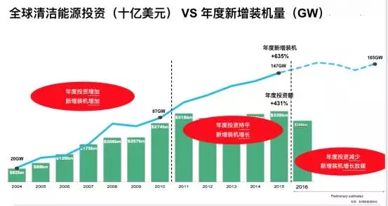 彭博新能源財經分析師劉雨菁在索比光伏網(wǎng)西安舉辦的“光伏創(chuàng)新領跑技術論壇”上發(fā)布了自己預測:2017年以后,光伏電站新增裝機增長將放緩,甚至隨著新能源發(fā)電成本下降,投資額下降,這可能是十余年來首次。