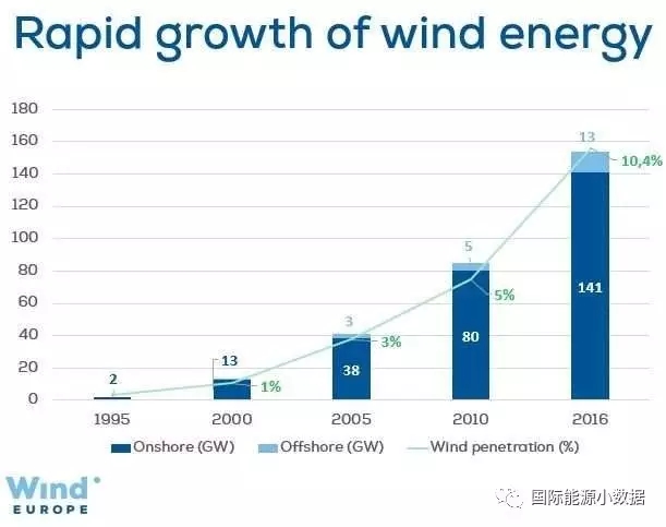 中國儲(chǔ)能網(wǎng)訊:根據(jù)Wind Europe的數(shù)據(jù),過去20年來風(fēng)電在歐洲(歐盟28國)迅速發(fā)展。到2016年底,歐洲國家風(fēng)電裝機(jī)已經(jīng)達(dá)到154吉瓦,其中13吉瓦為海上風(fēng)電;2016年風(fēng)電占發(fā)電量的比例達(dá)到10.4%。