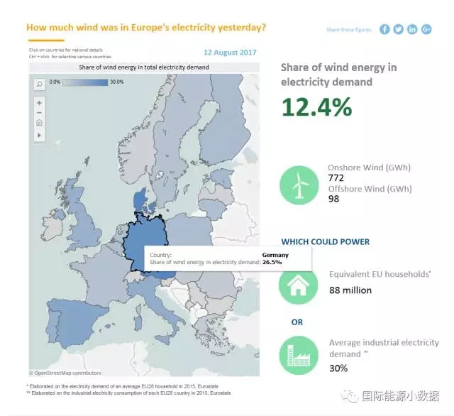 Wind Europe還跟蹤監(jiān)測歐盟28國每天的風(fēng)電發(fā)電情況。2017年8月12日這一天,歐洲風(fēng)電占比12.4%,其中德國風(fēng)電占比26.5%。