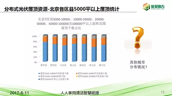 能量魔方北京市屋頂資源數(shù)據(jù)統(tǒng)計(jì)中分析,北京的七個(gè)區(qū),通州、大興、朝陽(yáng)、昌平、順義、海淀、房山是屋頂最多的區(qū)域。將北京七個(gè)區(qū)的屋頂按照不同的面積不同級(jí)別統(tǒng)計(jì)以后,發(fā)現(xiàn)5000-10000平的屋頂數(shù)目占比約60%,10000-20000平的屋頂數(shù)目占比約25%,從北到南取四個(gè)城市,天津、蘇州、上海、深圳對(duì)比分析,各面積范圍屋頂資源占比,得出的結(jié)果5000-10000占比60%,10000-20000占比25%,得出類比于著名的雅各布·博爾碎片規(guī)律,可提出一個(gè)理論,一所綜合性城市的工商業(yè)屋頂面積范圍分布規(guī)律是,5000至10000平屋頂個(gè)數(shù)占比約60%,10000至20000平屋頂個(gè)數(shù)占比約25%。85%的屋頂都是2000-5000平米之內(nèi).大量的面積針對(duì)中小型企業(yè)。